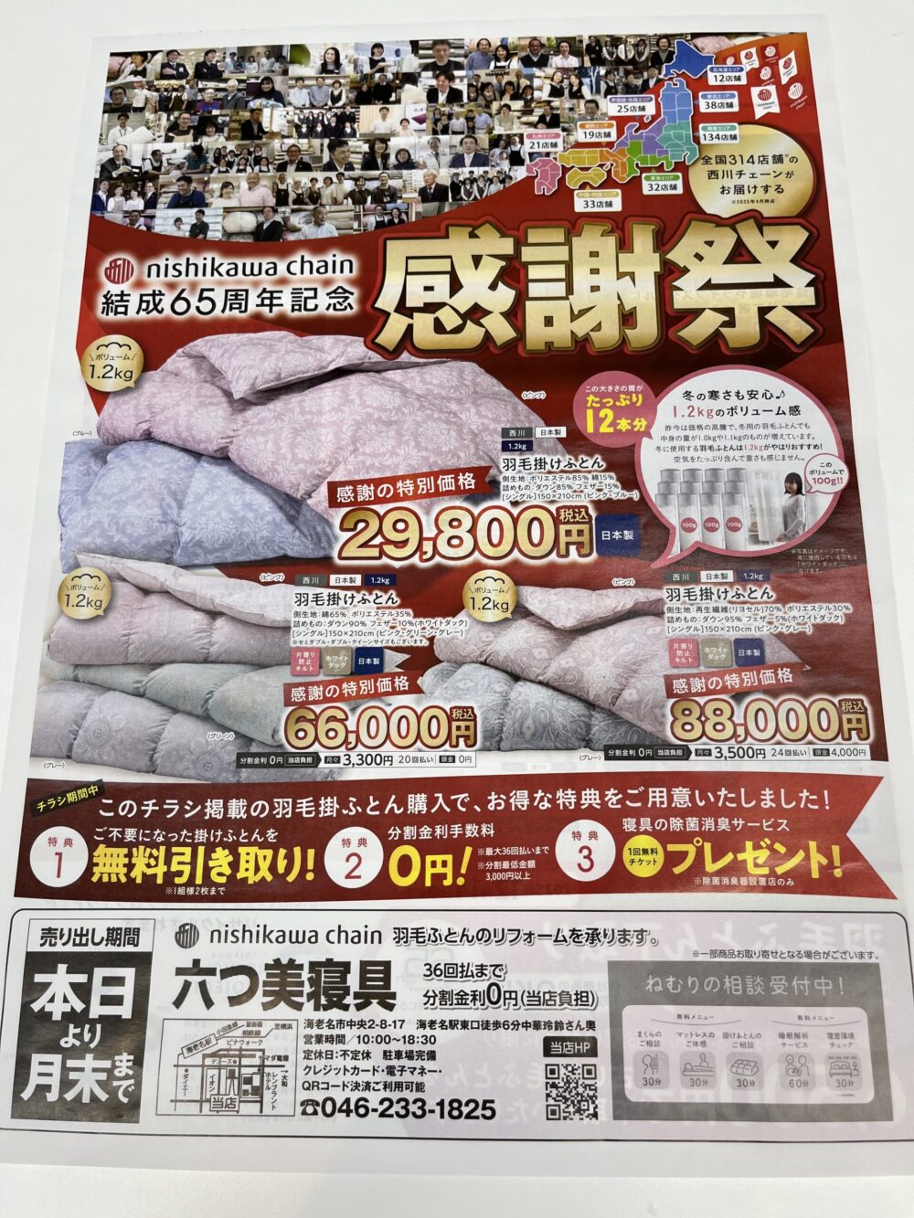 いつもご愛顧いただきありがとうございます。 本日より「感謝祭」開催します。 羽毛ふとんの掛け比べなど、スリープマスターがお客様のご相談に応じます。 ご来店お待ちしてます。