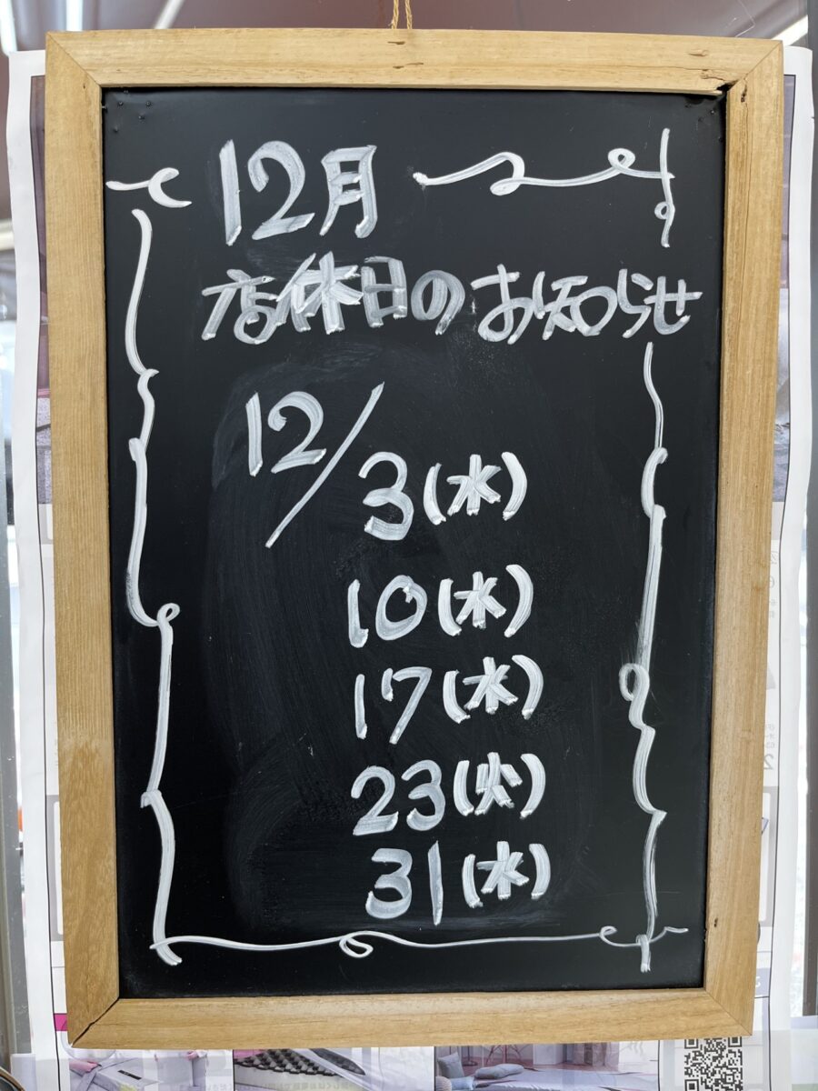 いつもご愛顧ありがとうございます。 12月店休日のお知らせです ◎年内営業日は30日(火)となっております。